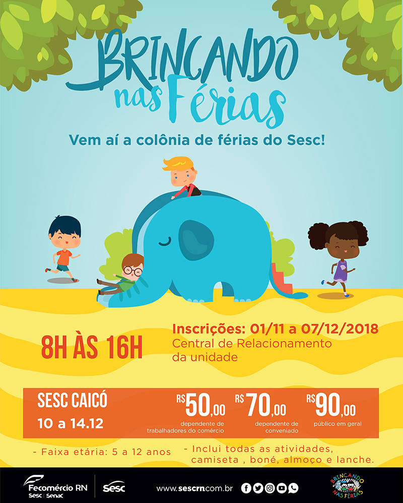 Uma colônia de férias repleta de atividades para crianças de 4 a 12 anos. Esse é o Brincando nas Férias, projeto do Serviço Social do Comércio do Rio Grande do Norte (Sesc RN), instituição do Sistema Fecomércio, que será realizado em dezembro nas unidades Sesc Potilândia (Natal) e Sesc Caicó. As inscrições podem ser feitas nas centrais de relacionamento das unidades de 1/11 a 7/12 em Natal e, em Caicó, de 12/11 a 5/12.