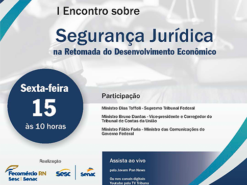 O Sistema Tribuna de Comunicação, em parceria com o Sistema Fecomércio RN, Sesc, Senac, promovem nesta sexta-feira (15), a partir das 10h, o encontro sobre “Segurança Jurídica na Retomada do Desenvolvimento Econômico”. Para acompanhar as palestras, acesse o canal do Youtube da Tribuna; e pela Jovem Pan News 93,5 FM.