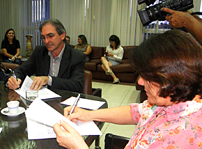 O presidente do Sistema Fecomércio, Marcelo Fernandes Queiroz, a diretora regional do Sesc RN, Jeane Eliad Amaral, e a reitora da UFRN, Ângela Paiva, assinaram no final da tarde desta quinta-feira, 18, a renovação – por mais um ano – do convênio que deu origem ao projeto “Parcerias Sinfônicas”. Na prática, a assinatura permite a continuidade do trabalho que o Sesc realiza desde 2011, de incentivo ao desenvolvimento artístico dos músicos em formação da Orquestra Sinfônica da UFRN (OSUFRN).