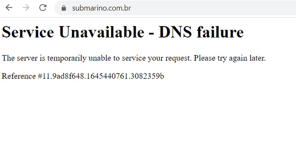 Quem tenta acessar as páginas, encontra um aviso de que o serviço está indisponível devido a uma “falha de DNS”.