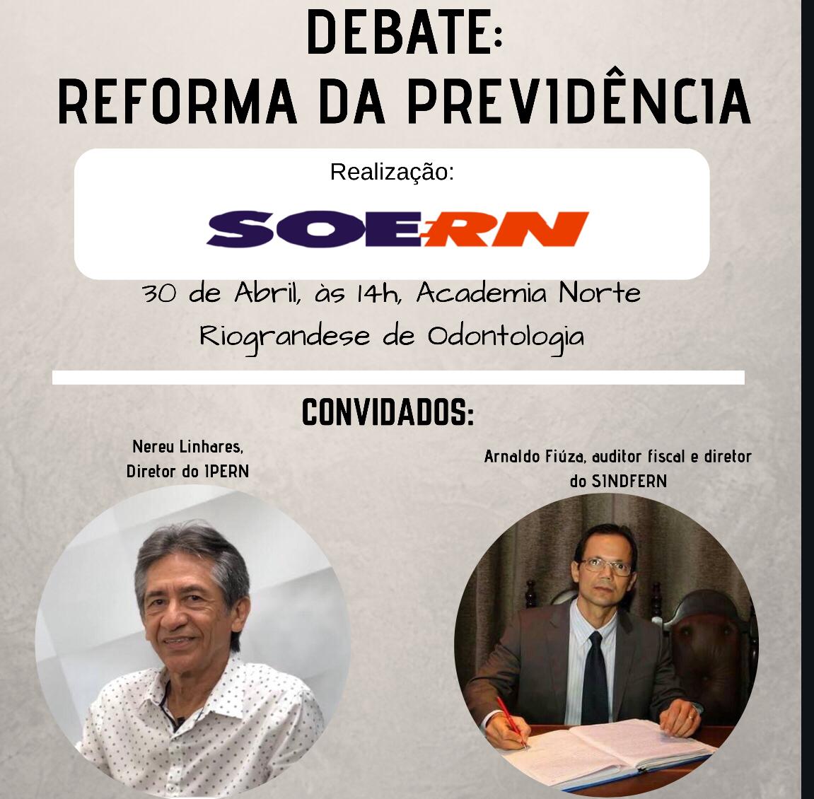 No dia 30 de Abril, o Sindicato de Odontologia do Rio Garnde do Norte – Soern promoverá a palestra/debate sobre o tema “Reforma da Previdência”. Na ocasião, debaterão com a classe odontológica, os doutores Nereu Linhares, presidente do IPERN, Arnaldo Fiúza advogado e auditor fiscal e diretor do SindFern. A palestra acontecerá na Academia Norteriograndese de Odontologia.