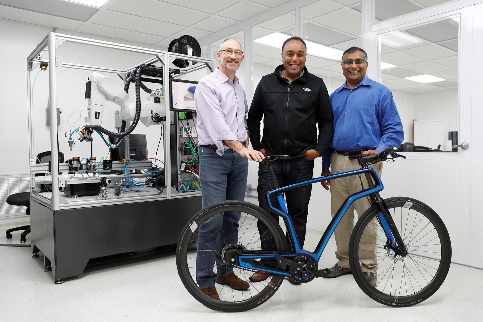 A Arevo está usando a bicicleta para demonstrar sua tecnologia de impressão e software de design, que espera usar para produzir peças de bicicletas, aeronaves, veículos espaciais e outras aplicações em que os projetistas precisam de força e leveza da fibra de carbono, mas enfrentam o custo elevado de produção do material.