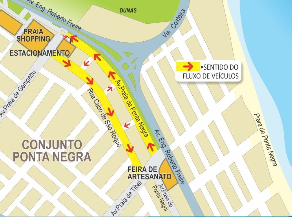 O novo sistema de binário começa a operar nesta terça-feira (21). Com a mudança, o complexo viário da Avenida Praia de Ponta Negra passa a ser no sentido único Feira de Artesanato/Praia Shopping. Já a Rua Cabo de São passa a ser no sentido contrário, Praia Shopping/Feira de Artesanato.