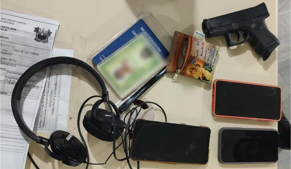 Com os suspeitos foi encontrada uma arma falsa, além de três celulares, um fone de ouvido, uma bolsa feminina e documentos pessoais de uma das vítimas dos assaltos que estavam sendo praticados pela dupla, além de uma motocicleta de cor preta com tanque coberto.