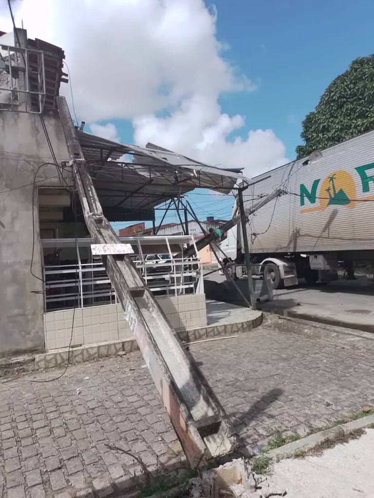 Postes caem e derrubam parte de teto de mercadinho após caminhão bater na fiação elétrica em Natal