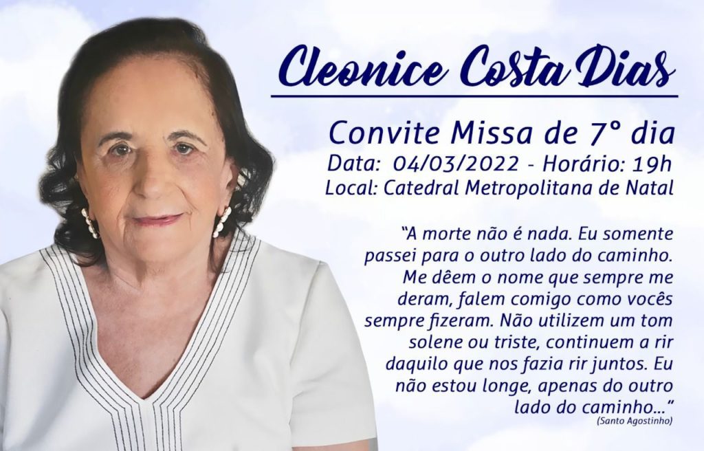 Nesta sexta-feira (04) será realizada a missa de sétimo dia de Cleonice Costa Dias na Catedral Metropolitana de Natal, às 19h.