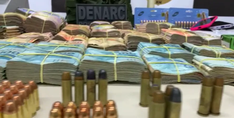 Lá, estava uma bolsa com R$ 141.385,00, além de dois revólveres calibre 38, munições variadas, caderno de anotações, capa de colete e munições de fuzil de calibre restrito.