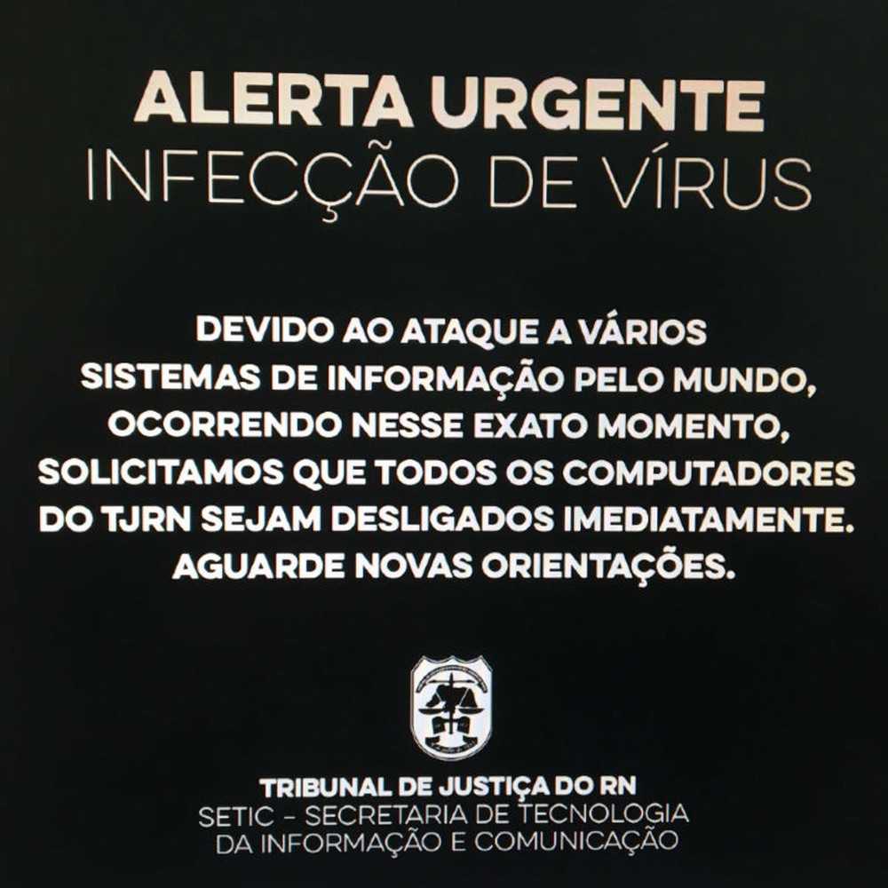 O site do Tribunal de Justiça do Rio Grande do Norte foi retirado do ar na tarde dessa sexta-feira (12) após os ciberataques em larga escala que derrubaram sistemas de informações de empresas e instituições na Europa. Além disso, o Ministério Público suspendeu os serviços de internet e email da instituição e o INSS orientou que todos os computadores do órgão fossem desligados. Segundo as instituições, as decisões foram tomadas por precaução e não há informações de ataques no Rio Grande do Norte.