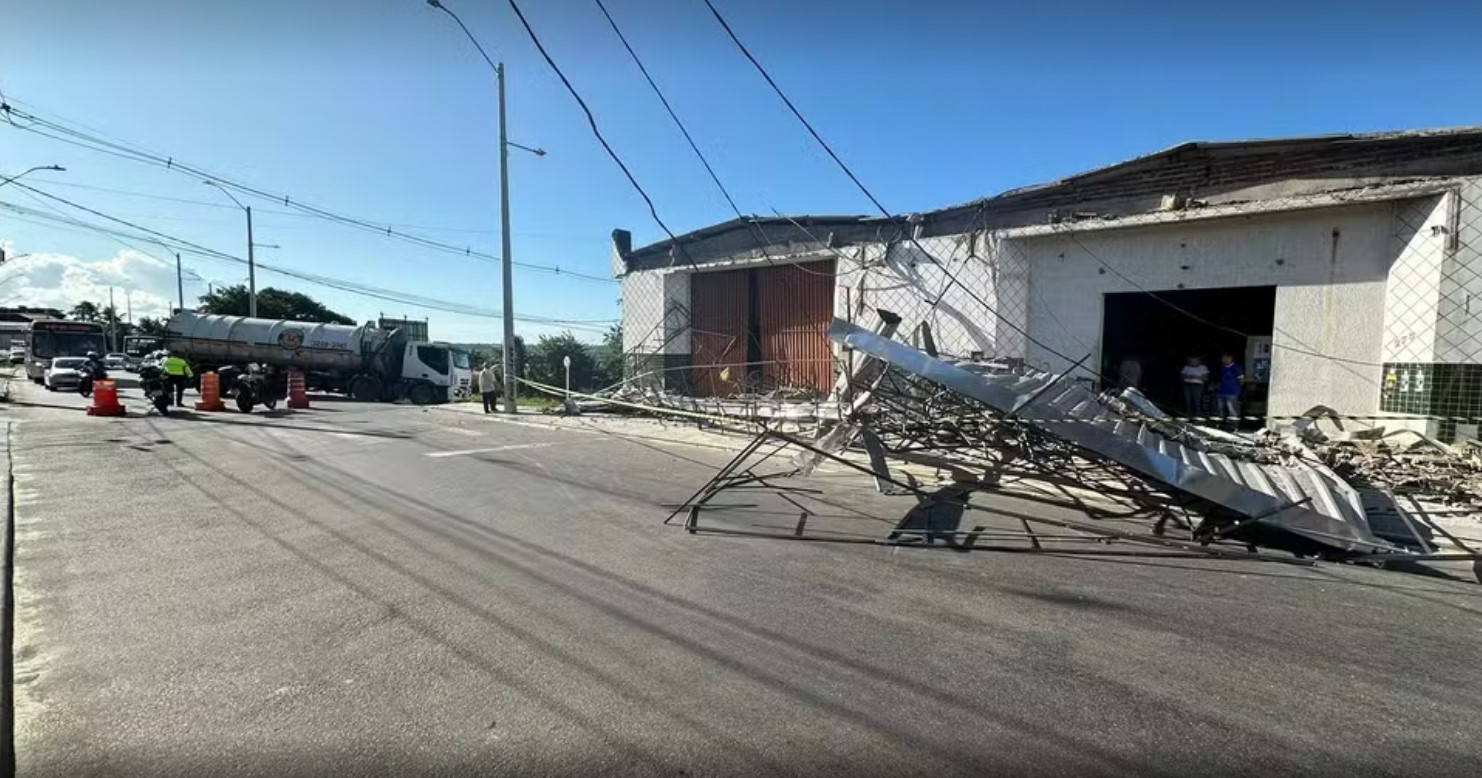 “Essa fachada caiu, cedeu por cima da estrutura, derrubando toda a estrutura metálica também”, explicou o tenente Diego Cavalcante, do Corpo de Bombeiros.