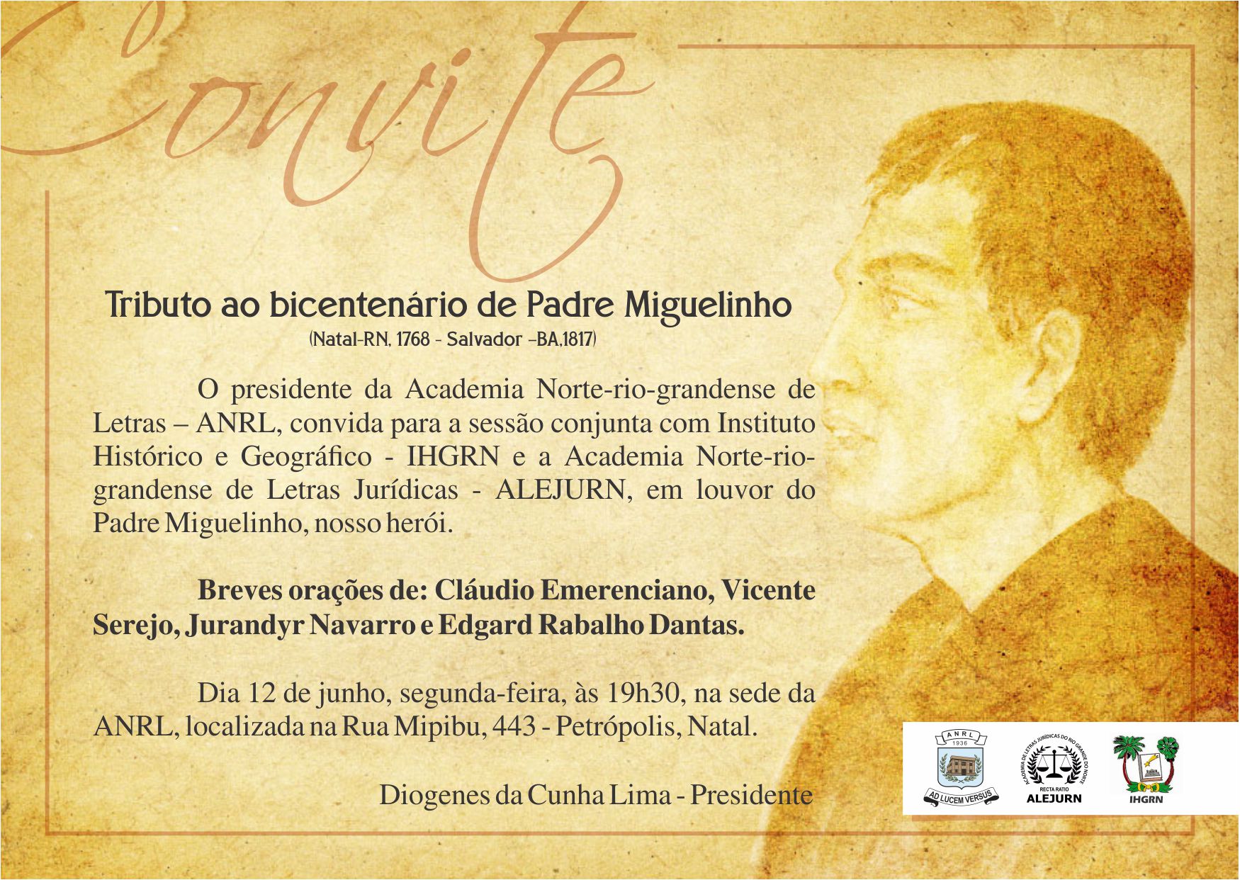 O presidente da Academia Norte-rio-grandense de Letras – ANRL, convida para a sessão conjunta com Instituto Histórico e Geográfico – IHGRN e a Academia Norte-rio-grandense de Letras Jurídicas – ALEJURN, em louvor do Padre Miguelinho, convida a todos a comparecer dia 12 de junho, às 19h30 na sede da ANRL, na rua Mipibu, 443, Petrópolis, para o Tributo ao bicentenário de Padre Miguelinho.