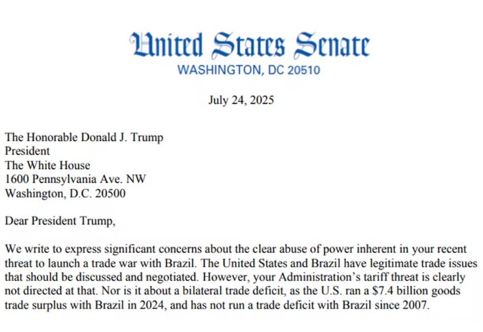 Senadores democratas enviaram uma carta ao presidente dos Estados Unidos, Donald Trump, contestando as tarifas de 50% impostas às importações do Brasil, nesta quinta-feira (24).