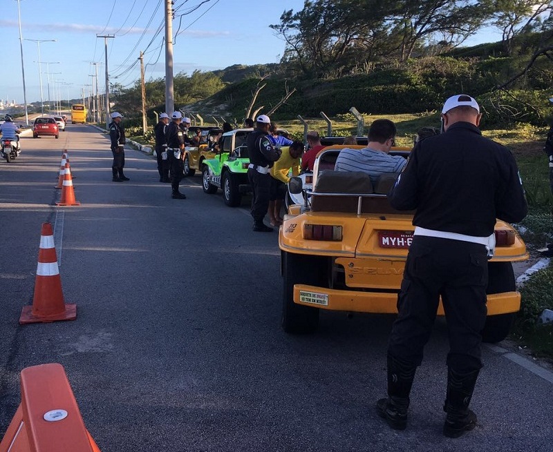 Policiais do 1° Distrito de Polícia Rodoviária Estadual (1º DPRE) realizaram ontem a Operação “Turista Seguro”, na Via Costeira de Natal, que resultou na fiscalização de 104 buggys, seis táxis, quatro Vans e três ônibus de turismo, que faziam transporte de turistas. Durante a operação foram checados os documentos de porte obrigatório e feito o teste de etilômetro nos condutores dos veículos. Turistas brasileiros e estrangeiro passaram pela barreira e elogiaram a atuação policial. Na ação, cinco condutores foram notificados, sendo recolhidas duas carteiras de habilitação. Outros dois condutores não portavam documentos e um estava com o documento do buggy atrasado. Dois adolescentes foram apreendidos ao tentarem fugir da barreira policial. Eles estavam com uma motocicleta roubada. Com eles também foi apreendido diversos materiais como notebook, bolsas, dinheiro e várias joias. A dupla foi conduzida à delegacia para os procedimentos cabíveis.