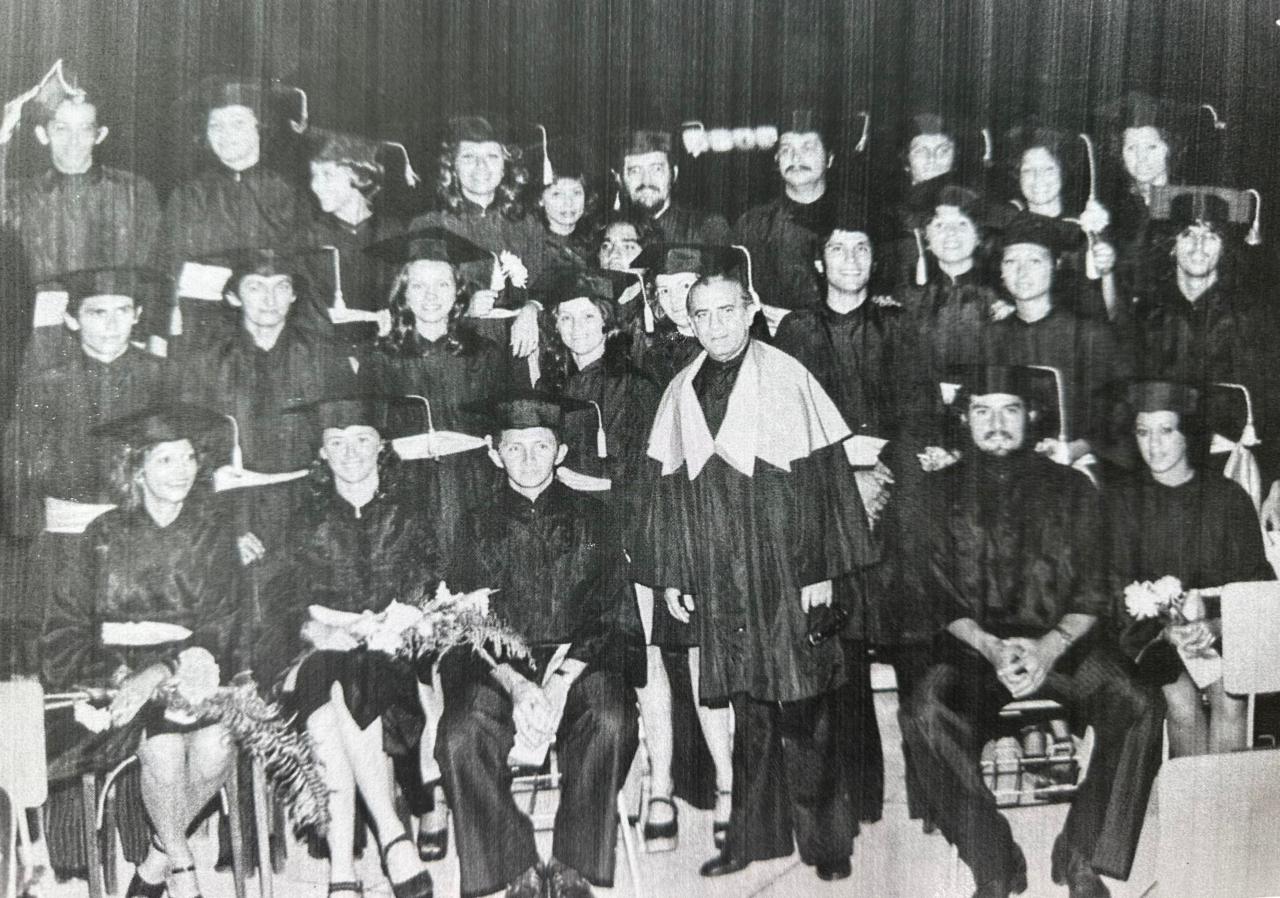 A foto em preto e branco foi tirada no dia 14/12/1974, na formatura da primeira turma de Economia no campus da UFRN.