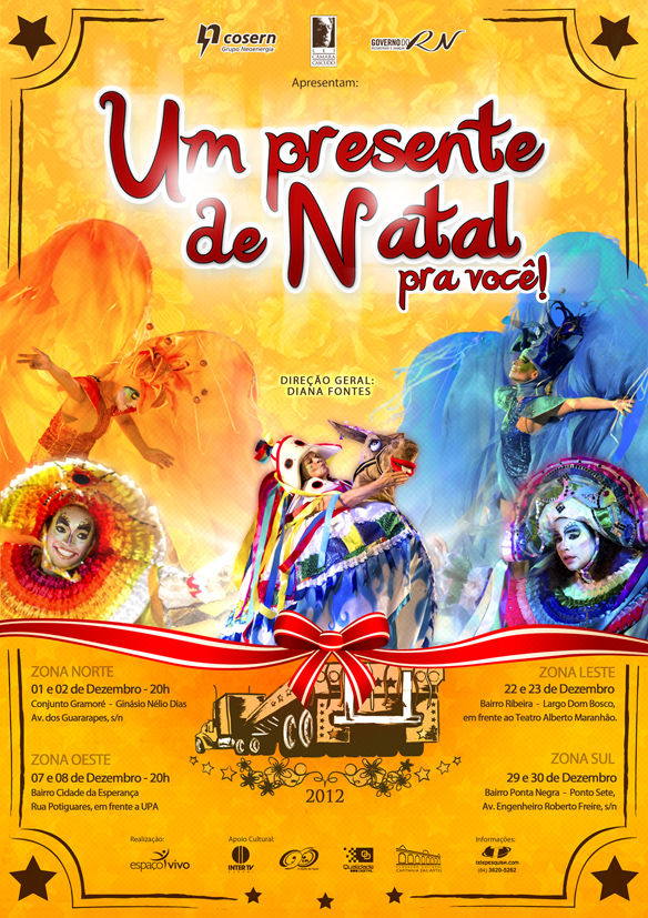 O espetáculo natalino “Um Presente de Natal” terá início no próximo dia 1º de dezembro, com oito apresentações nas quatro zonas de Natal. Com o apoio do Governo do Estado, através da Lei Câmara Cascudo e patrocínio da Cosern – Grupo Neoenergia, este será um espetáculo itinerante, com o tema “Natal… Abençoada Seja!!”