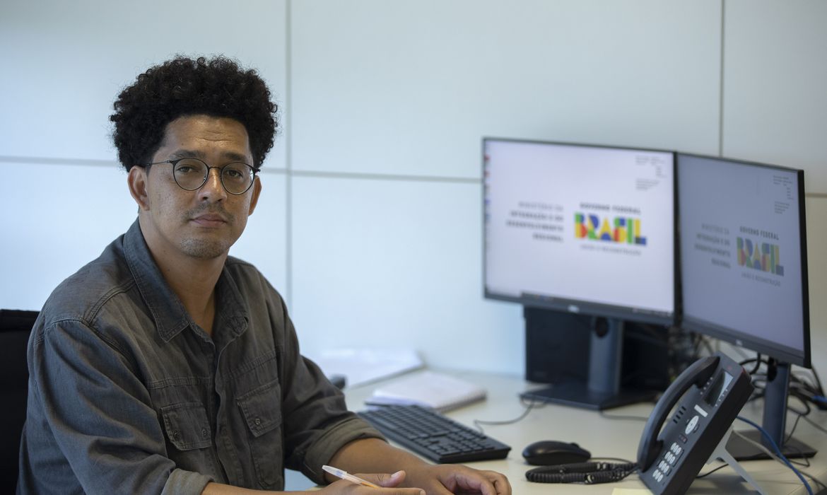 BRASêLIA (BRASIL), 02/02/2023. - O Secretaria Nacional de Pol’ticas para Territ—rios PerifŽricos, Guilherme Sim›es Pereira posa para fotografia ap—s conceder uma entrevista para Agencia Brasileira de Noticias (EBC) em seu gabinete no Ed. Celso Furtado em Brasilia (Brasil). Foto: EBC/JoŽdson Alves.