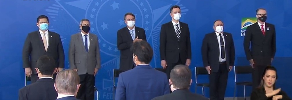 Em uma cerimônia na qual ele e as demais autoridades usavam máscara, o presidente Jair Bolsonaro sancionou nessa quarta-feira (10) a lei que facilita a compra de vacinas contra a Covid-19. Geralmente, Bolsonaro não usa máscara — nem os ministros e assessores, nas aparições públicas ao lado do presidente.