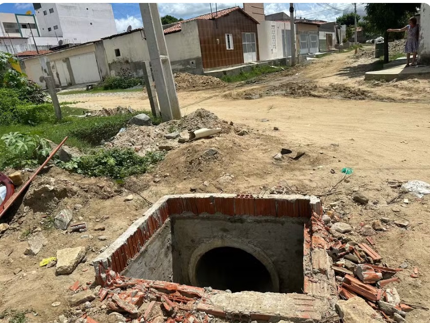 Segundo a moradora Cleide Lucimar de Medeiros, existe uma obra inacabada na rua há pelo menos dois anos.