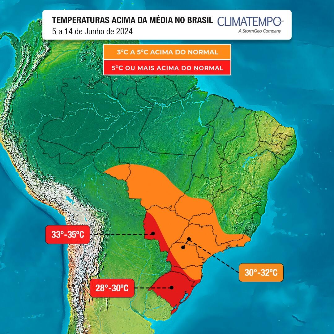 Esse mesmo sistema de alta pressão que provoca o bloqueio também favorece ingresso de ar quente sobre áreas do setor oeste e sul do Brasil, e com isto, as temperaturas devem ficar bem acima da média em áreas do oeste e sul de Mato Grosso do Sul e em parte da Região Sul, especialmente o Rio Grande do Sul, onde as temperaturas vão ficar entre 5 e 8 graus acima da média por um período bem prolongado.