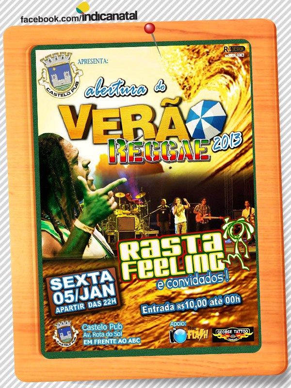 O super show da abertura do verão no Castelo Pub será nesta sexta-feira, 04, com a banda Rastafeeling. A banda promete agitar a noite com as melhores canções do grupo, sem deixar de tocar os principais sucessos do reggae nacional e internacional. E não para por aí, a festa ainda conta com a participação de vários convidados especiais. Os ingressos custam R$10 até a meia noite. A festa começa a partir das 22h. O Castelo Pub fica na Rota do Sol, em frente ao estádio do ABC.