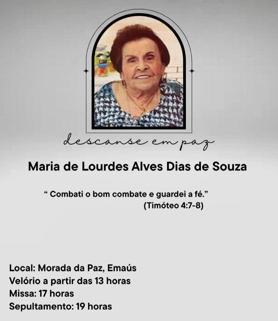 Nós que fazemos o Blog Ponto de Vista prestamos nossos sentimentos aos familiares e amigos de Maria de Lourdes Alves Dias de Souza, carinhosamente chamada de Diuda, falecida hoje (11), aos 97 anos. Ela era esposa do deputado José Dias e irmã de Aluízio Alves