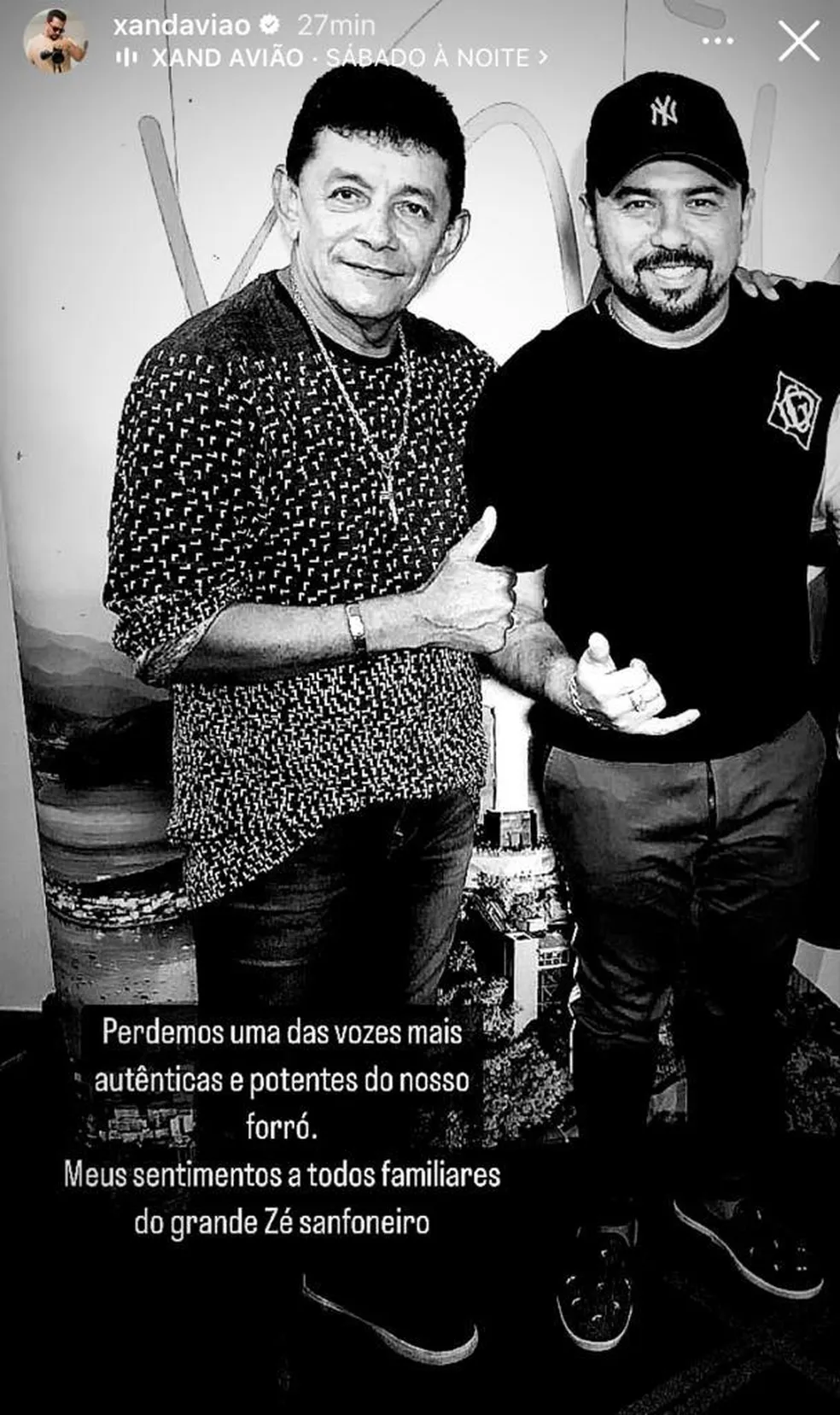 O cantor de forró Xand Avião lamentou, através de suas redes sociais, a morte do cantor e compositor Zé Sanfoneiro nesta quarta-feira (8) em Natal. Ele publicou uma foto ao lado do colega de profissão e escreveu: “Perdemos uma das vozes mais potentes do nosso forró. Meus sentimentos a todos os familiares do grande Zé Sanfoneiro”.